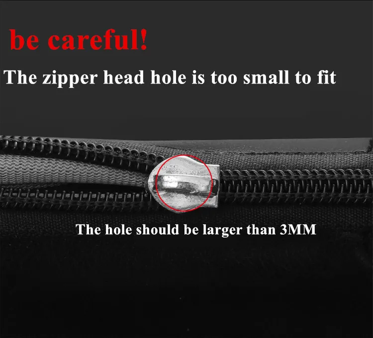 2.If your zipper head hole is too small to fit in, the hole should be larger than 3MM, so you need to confirm whether your zipper head size is suitable for this product before purchasing. thank you
