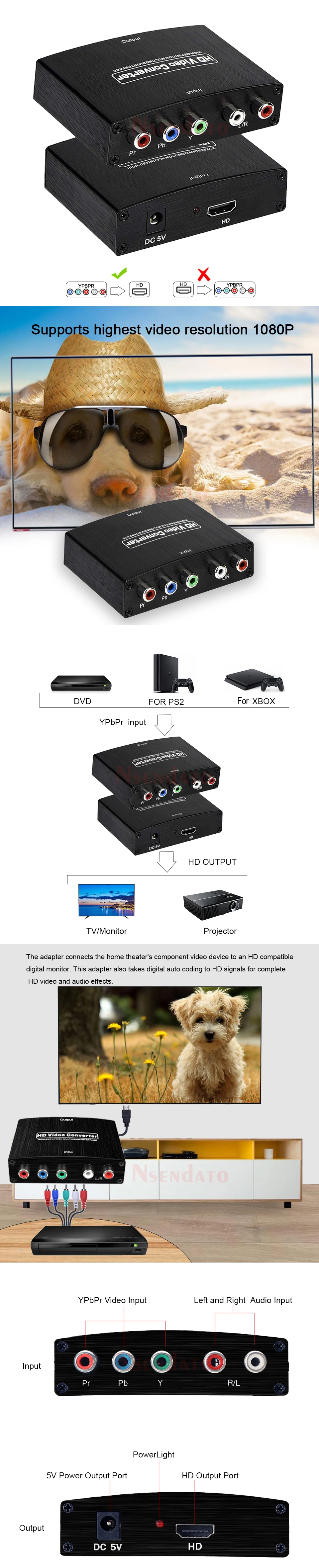 【Component (input) to HD (output) Converter】 YPbPr to HD adapter converts analog component video and R/L audio signal to digital HD signal, enables your old DVD player, cable box and gaming consoles to work with your fancy new television, display and projector. (NOTE: This is a Component to HD Converter, not an HD to Component Converter, can not be used reversely.)